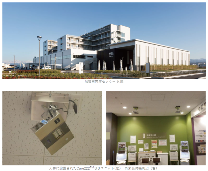 当社は、有人環境下で使用できるウイルス抑制・除菌用紫外線照射装置「Care222®」U3ユニット30台を、加賀市医療センター(石川県加賀市、病院事業管理者 清水康一)に設置し、10月7日より稼働を開始しました。これは、ウィズコロナ時代の新型コロナウイルス感染防止対策の一環として、加賀市が全国の自治体に先駆けて加賀市医療センターに本格導入したもので、飛沫感染や接触感染のリスクが高いとされている受付カウンターや再来受付機・精算機周辺、ならびに発熱・救急待合などに設置されました。