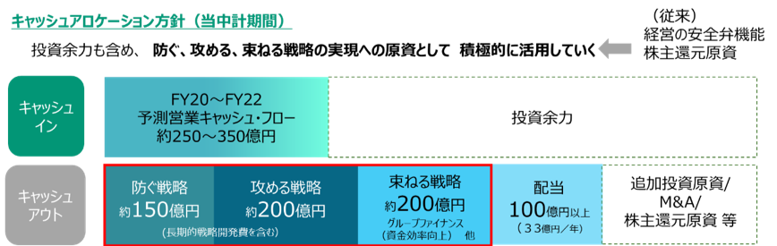 新中計では、3つの戦略(防ぐ、攻める、束ねる戦略)を明確化し、それぞれの実現の原資としてキャッシュなどの財務余力を積極的に活用していく考えです。