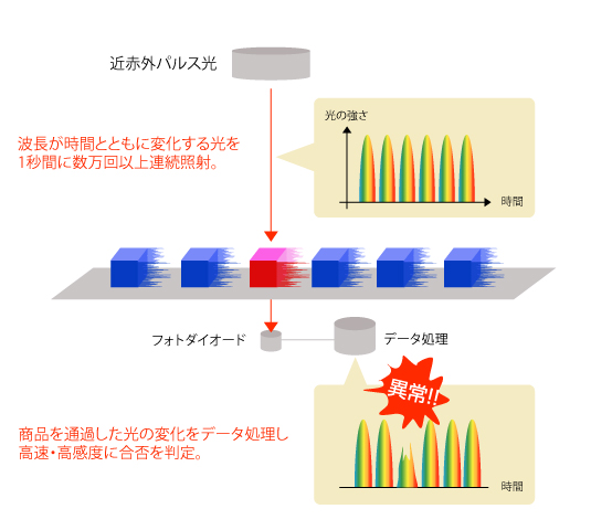 ひとつの商品に、数百回以上のパルス光を照射・測定し、その複数の結果を積算することによりミリ秒オーダーで信頼性の高い判定結果が得られます。