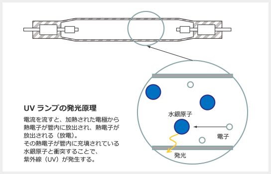 それがウシオの光技術。長年にわたりUVランプに水銀が使われてきたのには理由があり、高出力な紫外線発光には水銀は必須とされています。