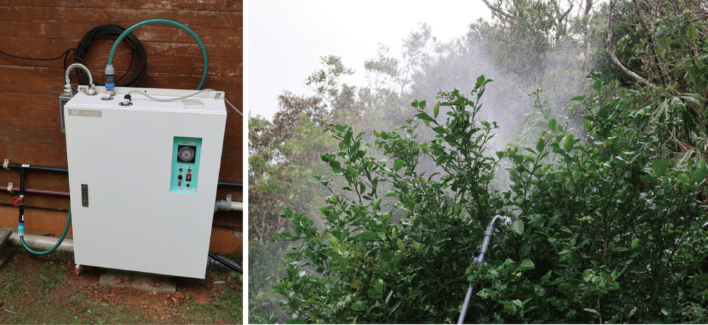 (左)ジーベックスが農園に設置している三協エアテック製オゾン水製造装置 (右)オゾン水噴霧の様子
