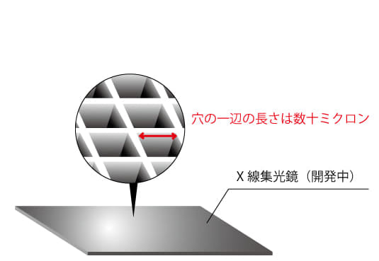 一方、その透過力の高さゆえに光学的なミラーやレンズをつくるのが非常に困難なため、一部の基礎研究用途を除き、産業用途での利用・普及が進んでいないのが現状です。しかし、微弱なX線を集光できる光学部品が開発できれば、これまでの技術では実現困難だった検査や観測が可能になり、「見ることができなかったものが、見えるようになる」だけではなく、検査・測定プロセスの高速化、機器の小型化も可能になります。