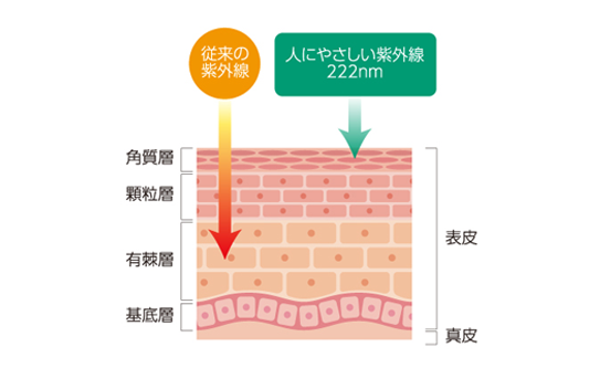 222nm照射装置(SafeZoneUVC®)はKrCl(ピーク波長222nm)エキシマランプを用い、危険な230nm以上の波長を特殊フィルターでカットすることにより、本装置は、細菌を貫通し死滅させることができますが、細胞レベルではヒト細胞核まで、組織レベルでは皮膚では、角質に吸収され、表皮細胞まで到達することがありません(図)。そのため、従来の紫外線ランプの殺菌作用のメリットは維持しつつ、従来の紫外線よりもヒト細胞の生物学的損傷が劇的に少ないことが判明しています。