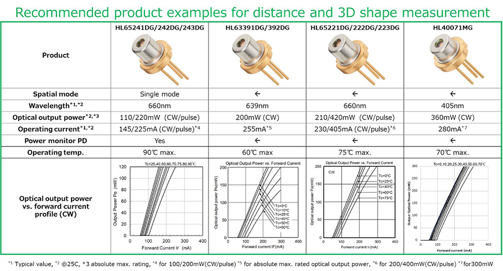 したがって、一般的な計測システムと同じく、レーザーダイオードの電力効率の高さ、許容動作温度の高さなどは、距離・3D形状計測においても重要な要素です。