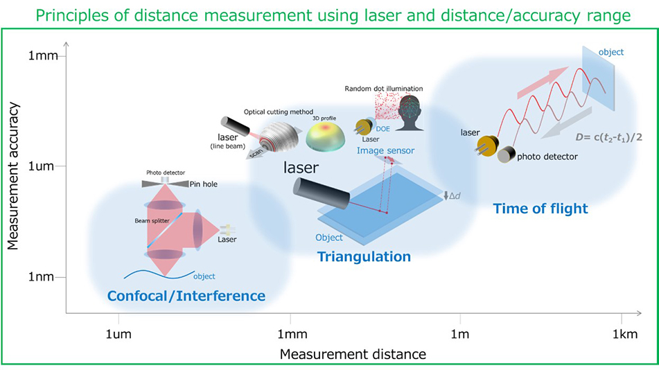レーザー光による距離計測の方法は、計測しようとする距離や精度によって分類できます。