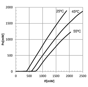 これにより、シングルエミッタLDとしては、世界最高のCW光出力1.5Wで、寿命20,000時間を達成。プロジェクターの高輝度化、光源の低コスト化、長寿命化に寄与すると共に、プロジェクター用途で非常に重要視される高温動作にも対応しました(55℃でCW光出力1.0Wを実現)。これにより冷却機構の簡素化にも寄与します。