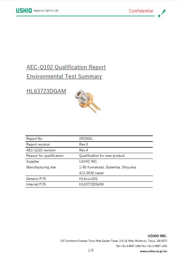 ウシオ電機株式会社(以下ウシオ)は、85℃高温動作対応の波長642nm赤色レーザーダイオードHL63723DGに、車載グレード信頼性基準AEC-Q102に準拠した製品「HL63723DGAM」を2026年3月よりラインアップに加えました。