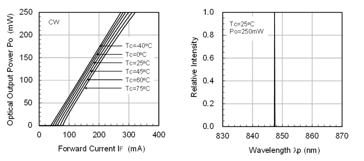 • 780nm帯から850nm帯レーザーダイオードは、ナイトビジョンやセンサー等の精度を必要とするアプリケーション用途で用いられております。これらLDは良好なビーム品質が求められますが、当社社独自の設計技術により、品質の良いビーム特性を実現しております。近年の市場ニーズに応えるべく、良好なビーム品質を維持したまま、高出力化、高効率化を実現し、850nm 250mWのLDを製品化しました。また、ラマン分光分析やICG分析等、バイオメディカル、ライフサイエンス用途に、785nm200mWのLDをラインアップしております。