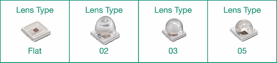 例えば、850nmのLED、SMBB850DS-1100-** (**はレンズタイプを示す)の総出力は1400mWですが、放射強度(光軸上の単位立体角当たりの光束)は選択したレンズに依存します。レンズなしフラットタイプの場合、放出光の広がりを示す放射発散角は±64°と大きく、放射強度は460mW/sr(ミリワット/ステラジアン)となります。集光性の高い高輝度出力を必要とする用途には、02レンズタイプを用いると、放射発散角はわずか±10°となり、放射強度は6000mW/srにまで高めることができ、狭い領域を高照度で照射したい場合に最適です。また03レンズ、05レンズはフラットタイプと02レンズの中間の特性を持つレンズです。