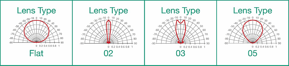 EDCファミリーは、フラットとS5の2種類のレンズタイプのいずれかを選択可能です。フラットレンズタイプは放射発散角が±66°の広角照明であるのに対し、S5タイプのレンズでは、より狭角(±39°)の照明を実現しています。