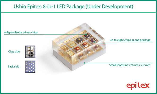 さらに多波長を用いた複雑な照明の需要に応えるべく、1つのパッケージに最大8種類のチップを組み込むことができる新しいパッケージを開発中です。