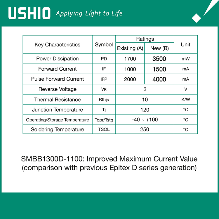 ウシオはこの度、epitexブランドのハイパワー短波長赤外線(SWIR)LEDチップである「SWIR LED Dシリーズ(SWIR Dシリーズ)」の信頼性試験を完了し、1,000時間を超える長時間動作においても、発光層に質的な劣化がないことが確認されました。そこで、SWIR Dシリーズおよびパッケージの設計を変更することなく仕様上の最大電流値(Imax)を連続駆動で1.5A、パルス電流※1で4Aへと倍増します。新仕様は2022年11月出荷分から適用となります。