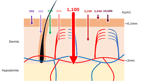 また、バイオセンシング分野においても貢献が期待されます。波長1100nmは生体組織への生体侵入長が長いため、生体組織の内部や深部にまで光が到達し、深部の計測やイメージングに適しています。この特性は、生体組織の微細な構造や病変部の評価において、より正確な情報を提供することができます(図1)。さらに、波長1100nmは精細度の高いCMOSイメージセンサに感度があります。CMOSイメージセンサは、現代のバイオセンシング研究や医療診断において広く使用されており、1100nmのLEDを使用することで、 微細な構造や細胞の観察、分析が可能となり、バイオセンシング分野における研究の進展や非侵襲生体診断の精度向上に貢献することが期待されます。