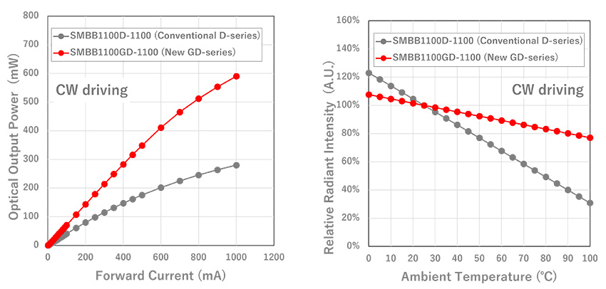 本製品のチップではGaAs(ガリウムヒ素)系材料を採用することで、既存製品「Dシリーズ」の1100nm製品と比較して光出力が約2倍となり、CW駆動において駆動電流1Aで590mW、Pulse駆動において駆動電流2Aで880mWと世界最高クラス※の光出力を実現しています。また、光出力の向上によってエネルギー効率(Wall-plug efficiency)も1.8倍程度向上したことにより、LED駆動中の発熱量が小さくなることで、光出力や波長シフトなどの特性値の変化も小さくなることが期待できます。さらに、本製品は温度変化による光出力の変動が「Dシリーズ」の1100nm製品と比較して小さく、放熱設計においてより扱いやすくなっています。