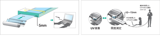 極小面積での高密度接着を行なうため、光源部と照射対象物を近接させることで高いUV照度を維持しており、定期的なUV照度管理が必要。現在は、光源部と照射対象物との照射距離間が狭いため、照射距離間を広げて測定している。しかし、実際の照射条件(距離や角度など)と異なるため正確な測定ができない上、測定後には都度、照射条件をセッティングし直す手間が発生する。