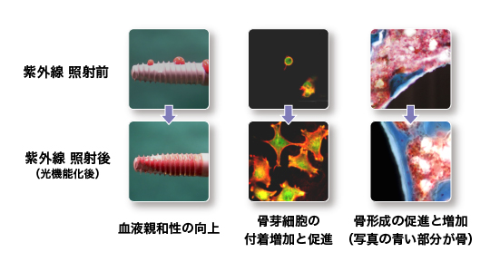 さらに同チームは、インプラント表面に付着した炭素化合物は特定の紫外線を照射することで除去され、インプラント表面の親水性が改善すること(紫外線による光機能化技術※4)により、骨細胞との結合能力が向上できる治療方法を考案していました。