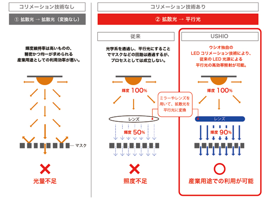 これに対しウシオは、40年以上に渡って培ってきたレンズやミラーなどの光学技術をLEDに応用・最適化することで、従来並みのLED実装密度で業界最高の平行光変換効率90%を実現するLEDコリメーション技術の開発に成功しました。