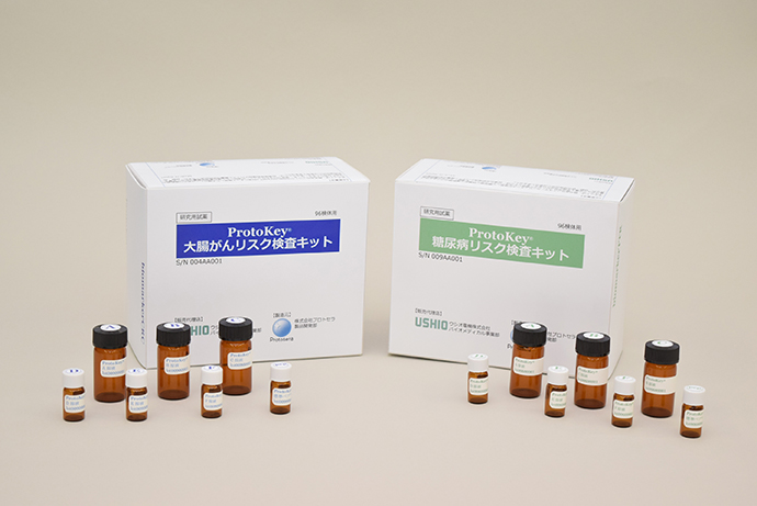 この度の共同事業では、ウシオがプロトセラの製造する『ProtoKey® 大腸がんリスク検査キット』と『ProtoKey® 糖尿病リスク検査キット』の2種類の研究試薬をバイオマーカーサイエンスに販売し、同社は臨床検査会社や病院、健診機関等の医療機関向けに大腸がんリスク検査と糖尿病リスク検査サービスを提供してまいります。