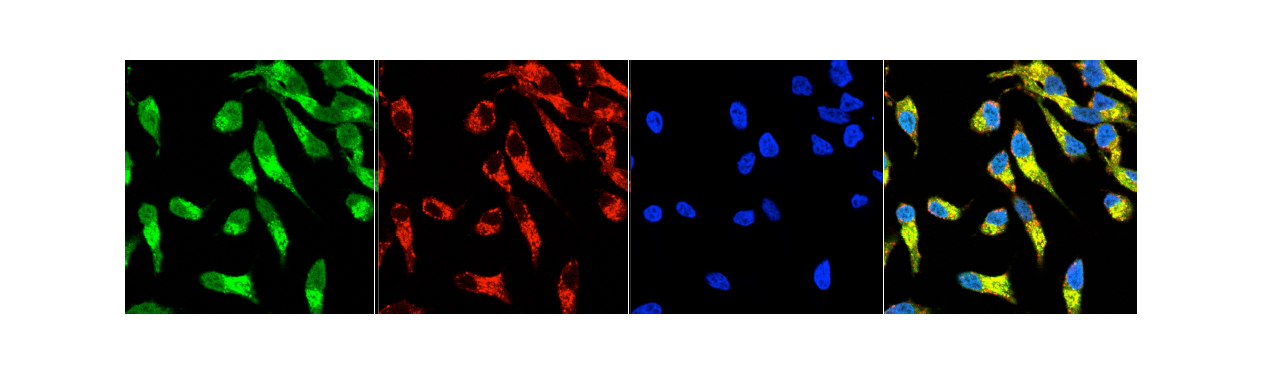 赤:Alexa Fluor®594標識2次抗体によるATP合成酵素β鎖の局在を示す