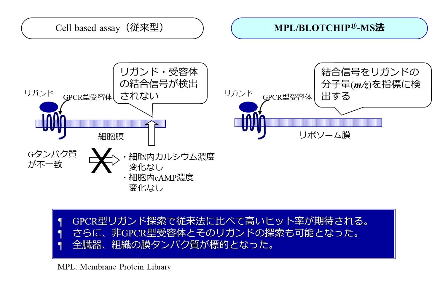 MPL/BLOTCHIP®-MS法で、従来技術では大変困難であった未知のリガンドと未知の受容体の探索・同定が実現し、生物の全身にあるリガンドと受容体を包括的に探索することが可能になりました。その特長は、【1】GPCR型リガンド探索で従来法に比べて高いヒット率が期待されること、【2】GPCR型以外の受容体とそのリガンドの探索も可能になったこと、さらに【3】全臓器、全細胞の受容体を含む全膜タンパク質が研究標的になったことなどを挙げることができます(図4)。