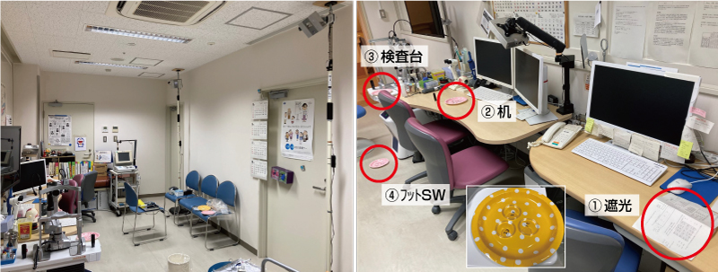 2台の「Care222®」搭載ユニットを、眼科外来診察室の天井付近に医師と患者の間にある検査テーブルが照射されるよう設置し、照射量はその部屋で1日8時間過ごしてもTLV(ACGIHが2022年以前に推奨していた22mJ/cm2)を超えないように設定しました。診察室で診察を行う6人の眼科医師を対象に、照射開始前、照射開始翌日、および1、 3、 6、 12か月後に眼の検査を実施。両眼の最良矯正視力、等価球面屈折度数、細隙灯検査所見(角膜びらんスコア、結膜充血スコア、翼状片の有無、白内障の有無、眼瞼皮膚の変化)、角膜内皮細胞密度、自覚症状、その他の有害事象を記録しました。なお、1年間の医師の平均診察室滞在時間は1週間あたり6.7時間でした。その結果、前向き観察で、急性有害事象(角膜びらん、結膜充血、眼瞼皮膚紅斑など)、慢性有害事象(翼状片、白内障、眼瞼腫瘍など)ともに認められませんでした。視力、屈折異常、角膜内皮細胞密度に変化はありませんでした。