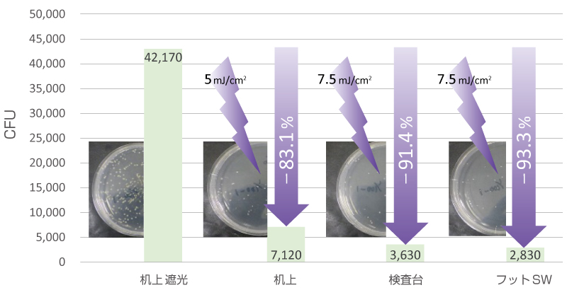 ・同診察室の机、検査台、床に留置した細菌・ファージへ222nm Far UV-Cを照射(5〜7.5mJ/cm2)。φX174ファージの >99%不活化および黄色ブドウ球菌の>90%不活化が見られた。