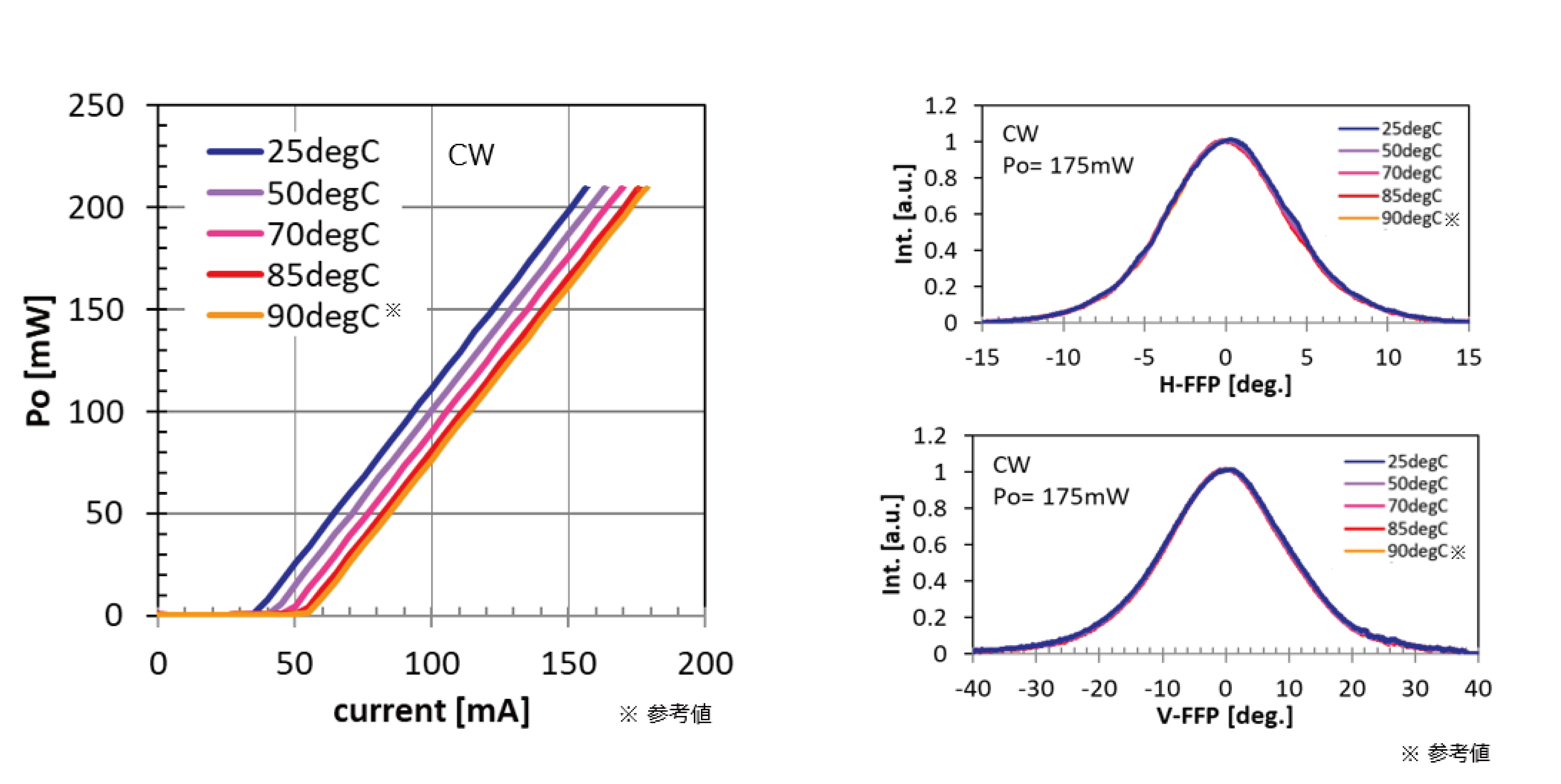 そこで、ウシオは、高度な結晶成長技術及び独自の光閉じ込め制御構造を採用することで、 -5℃から+85℃という同波長・同出力帯のLDでは業界で最も広い使用温度範囲を実現。また、その温度範囲全域にわたって光束密度が大きく、均一で安定したビーム特性と低アスペクト比を得る事に成功しました。
