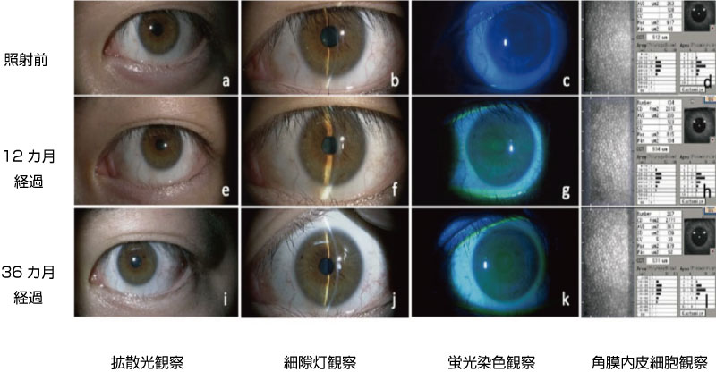 図2. 拡散光、細隙灯、蛍光染色および角膜内皮細胞の代表的な観察例