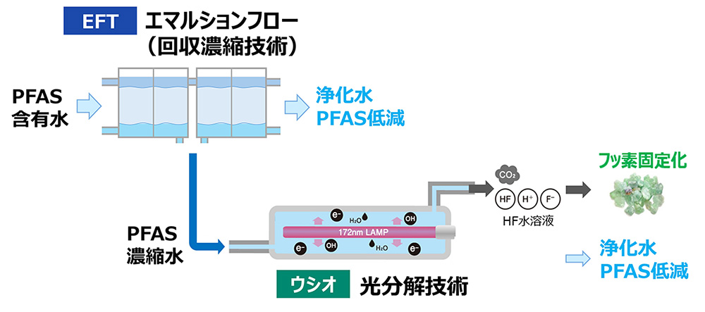 ウシオの光分解技術とEFT社のエマルションフローを用いたPFASの分解イメージ