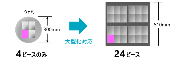 昨今、市場が急拡大している生成AIや自動運転を実現する次世代半導体においては、後工程のパッケージング技術がキーテクノロジーのひとつとなっています。なかでも、複数の半導体チップを並列に配置し、インターポーザー(中間基板)を介して接続し実装した2.xDパッケージは、データ通信の容量増加、高速化に伴い、さらに需要が拡大する見込みです。インターポーザーは、半導体の性能向上に伴いそのサイズが大型化しており、シリコンインターポーザーから有機材料を用いた有機インターポーザーへの移行が進んでいます。製造方法に関しては、円形ウェハから四角片を切り出す手法が主流ですが、インターポーザーのサイズが大型化することで、ウェハあたりのインターポーザーの取り数が減少するという課題が生じています。この課題に対処するため、円形のウェハ形状から四角いパネル形状へ変更し、インターポーザーの取り数を増加させる製造プロセスが注目されています。
