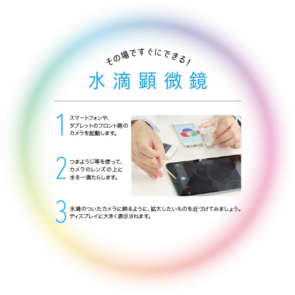 もう1つ簡単にできる実験をご紹介します。今はテレビの画素が細かいので、眼を凝らしてもRGBの光の点は見えません。しかしスマートフォンやタブレットのカメラ部分に水滴を置いて、ディスプレイを映すとRGBの画素まで見えるようになります。水滴がレンズの代わりになり、接写が可能になっているんですね。また、水滴が小さければ小さいほど倍率を上げることができます。これは昔からある水滴顕微鏡の原理。技術は進歩していますが、科学の原理は変わっていません。身のまわりにはたくさんの実験材料がころがっているんです。