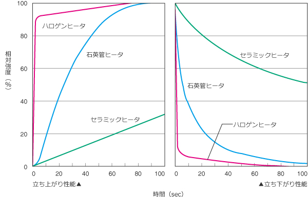 ハロゲンヒータは熱容量の小さなタングステンフィラメントを発熱体としています。