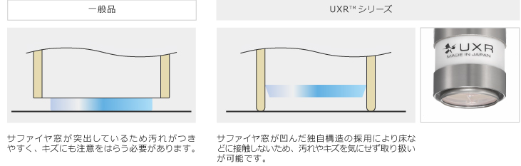 ウシオ独自の窓部構造により、ランプを直置きできる「汚れ/キズ防止構造」採用