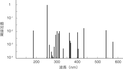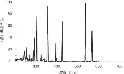 水銀の共鳴線として代表的な365nmと、250~320nmの範囲に強い線スペクトルを持っています。