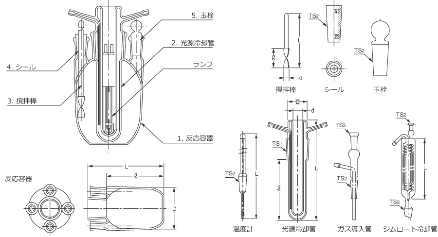 | 1 | 反応容器 | 175 | 135 | 95 | - | 45/40 | 15/35 | 15/35 | 15/35 | 15/35 |