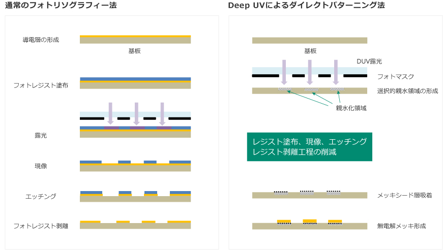 樹脂フィルム等にフォトマスクを介して親水化領域を選択的に作成。親水化領域にのみメッキシード層を吸着させた後、 無電解銅メッキパターンを形成。フォトレジストパターニングを介さずに導体形成が出来ます。