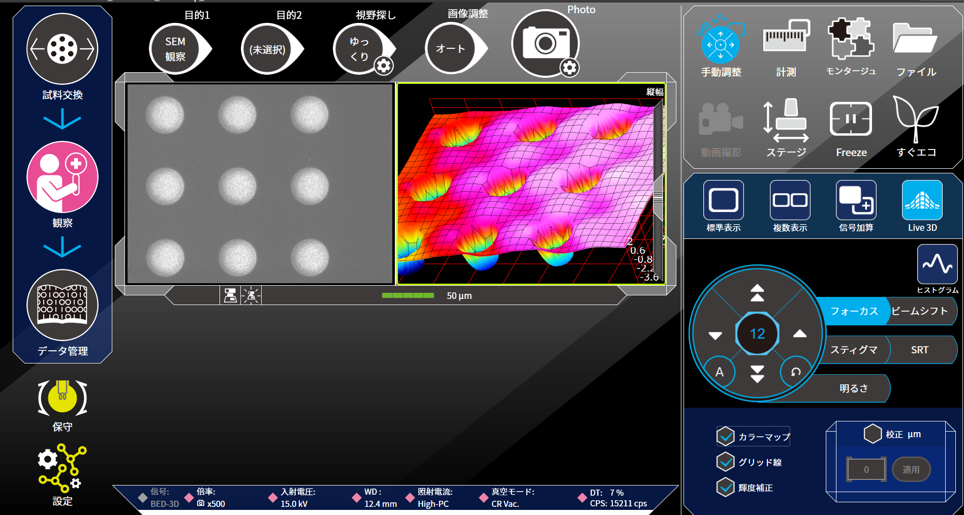 ハイスループットでありながら、省スペースかつシンプルで使いやすい操作性を実現した日本電子製卓上SEM(JCM-7000)です。光学カラー画像からSEM観察像へのシームレス(継ぎ目の無い)操作が可能なだけでなく、SEM観察しながらリアルタイムで元素分析が可能です。