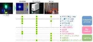 高輝度白色光のアプリケーション | レーザ励起蛍光光源(LDP)はその高輝度光の特性を活かした様々な用途に展開しています。インダストリアル用途における各種検査照明や耐光性試験、ファイバスコープといった用途や照明の中でもサーチライトや船舶照明、ファイバライティングといった特殊照明用途への応用が図られています。さらにバイオメディカル用途では高効率ファイバ導光が可能であることから各種内視鏡、顕微鏡用途に最適です。 |