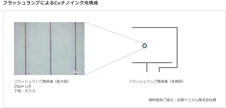 次世代プリンタブルエレクトロニクス配線として注目される導電性Cuナノインクはパターン形成後一定温度以上での高温焼成が必要です。この加熱工程においてフラッシュランプにより導電層のみを選択的に加熱することで耐熱性の低い下地基板でも熱影響を最小限にして極短時間の焼成を実現することが出来ます。