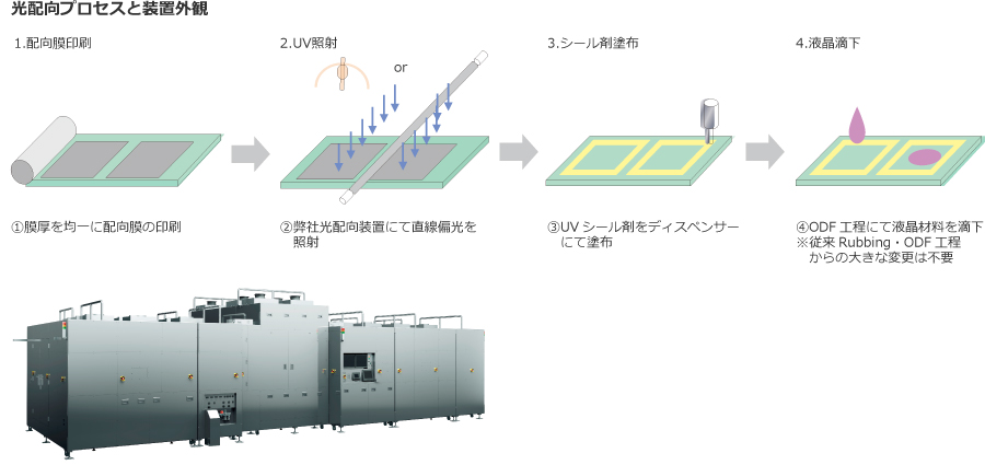 光配向装置とは、主にLiquid Crystal Display(以下、LCD)の生産に使用される。直線偏光の紫外線で配向膜に異方性を持たせ、液晶などを所定の方向に並べる装置です。