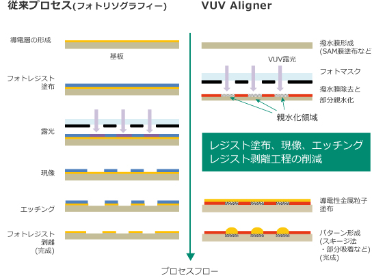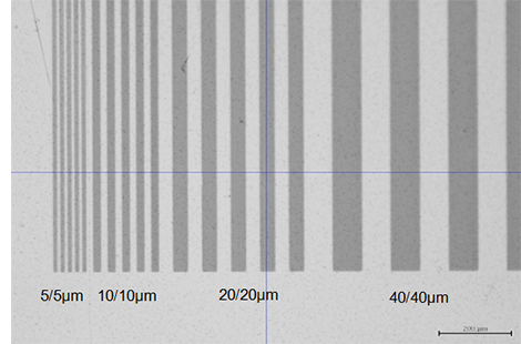 SAMパターニング 露光 改質 光学 液晶・ディスプレイ バイオ・化学 自動車・船舶 半導体 MEMS・電子部品 プリント基板・PKG 印刷 撥水性のSAM(自己組織化単分子膜)上にフォトマスクを介しVUV光を照射。VUV照射領域に親水パターンを形成。親水領域にのみ導電性ナノインクを塗布することで5umL/Sを形成。 SAM膜上での導電性Agナノインクパターン(20um Gap) 関連製品 プリンタブル パターニング用光源ユニット 「VUVアライナー」