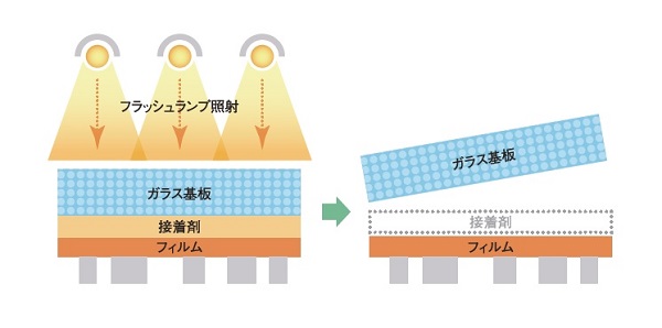提案された方法を検証すべく、ウシオ電機の姫路にある事業所内に設けられたオプティカルラボ(実験施設)で実験を協働で進めることとなります。 実験結果は、フィルム基板とガラス基板間に光を吸収する接着層を設け、 ガラス基板側よりフラッシュ照射することにより製品にダメージを受けること無く 瞬時に剥離を行うことができることを証明できました。S社では導入に向けて引き続き検証を続けていますが、 プロだからこそできるアドバイスをもとに最適な方法へ最短で到達する道をたどっています。