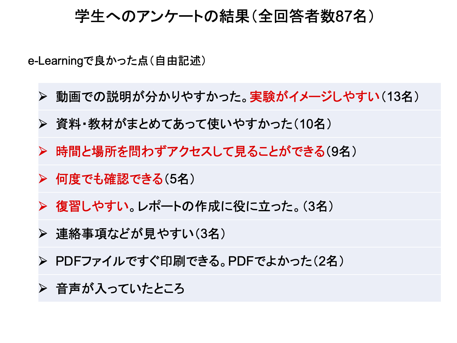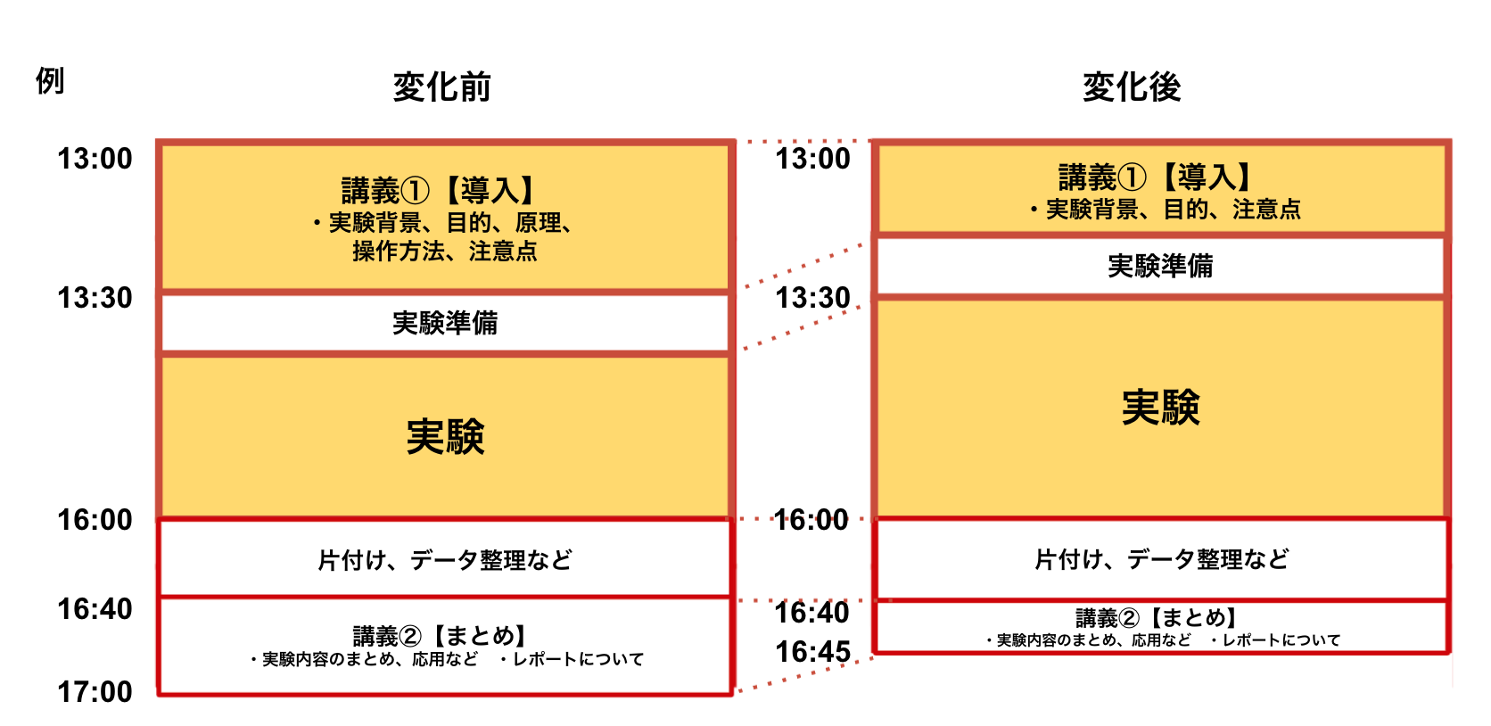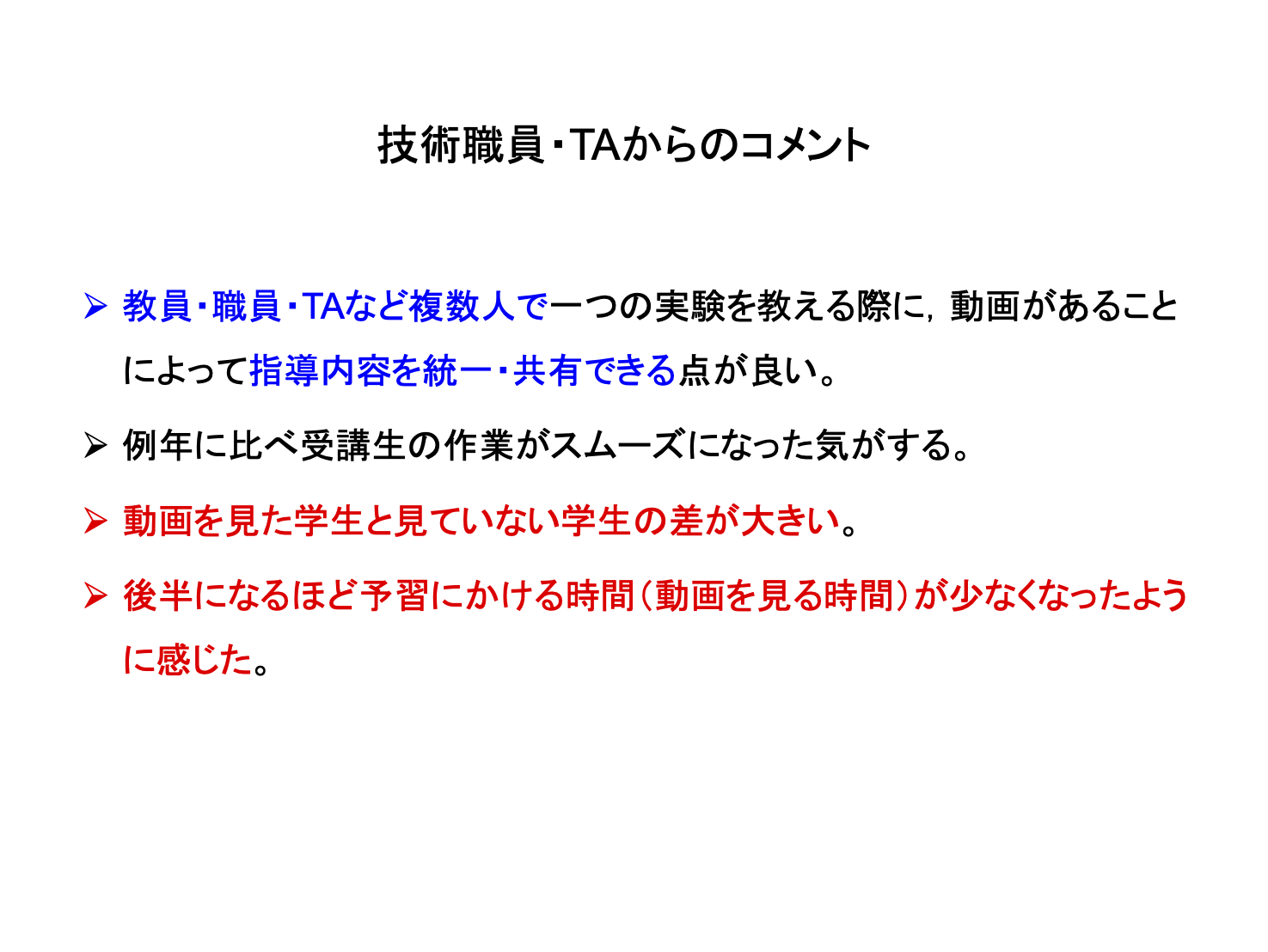 従来は導入の講義において当日行う実験内容の目的、背景、原理、操作方法、注意点といった説明に時間を要することが多かった。オンライン教材を使用した反転学習を実施することにより、導入時間や実験終了後のレポートの説明で話す内容を絞り従来の半分の時間まで短縮することを可能にし、学生が実際に自分で手を動かして学びを深める時間を充実させることができた。