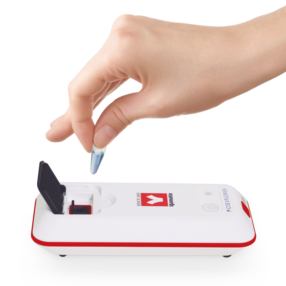ピコエクスプローラーは手のひらに簡単にのるサイズで、重さ200 gと持ち運びに大変便利な吸光度計である。側面にある穴にストラップをつけることで、首からかけて持ち歩くことも可能である。測定時間はわずか1秒で、測定後にその場でデータをスマホに掲示可能な上、データをパソコンに出力加工することができる。そのため、各地点で測定したデータをすぐに共有でき、特に、現場でのデータ測定が重要な分析化学の分野で活躍する。また、PCRチューブに入っている状態のままで測定可能なため、サンプルをチューブ内で作成したまま測定でき、サンプル量も少量で良いため節約できる。さらに、そのまま廃棄もできるため、廃棄処理が容易だ。