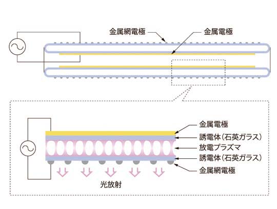 ランプは石英ガラスの二重構造になっており、内管の内側には金属電極、外管の外側には金属網電極がそれぞれ施され、石英ガラス管内には放電ガスが充填されている。電極に交流の高電圧を印加すると、2つの誘電体の間で細い針金状の放電プラズマ(誘電体バリア放電)が多数発生する。この放電プラズマは高エネルギーの電子を包含しており、かつ、瞬時に消滅するという特徴を持っている。この放電プラズマにより、放電ガスの原子が励起され、瞬間的にエキシマ状態となる。このエキシマ状態から元の状態(基底状態)に戻るときに、そのエキシマ特有のスペクトルを発光(エキシマ発光)する。発光スペクトルは、充填された放電ガスによって設定することができる。