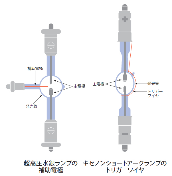 補助電極 auxiliary electrode(of a discharge lamp) ほじょでんきょく 解説 補助電極とは、主電極の補助機能をもつ電極のこと。 補助機能には、ランプの始動を容易にしたり、放電を安定にしたりするものなどがある。 →電極、始動電極、トリガーワイヤ(トリガーワイヤー)を参照。 ※ランプの放電を開始させるための補助電極を始動電極と言い、発光管(ガラス管)の放電空間内に、一対の主電極とは別に設けられ、第三電極と呼ばれることもある。発光管の外側にワイヤなどを設け、始動電極とするトリガーワイヤと呼ばれるものもある。 関連用語 主電極 電極 関連製品 関連URL 付属資料 用語50音一覧 あ行 か行 さ行 た行 な行 は行 ま行 や行 ら行 わ行