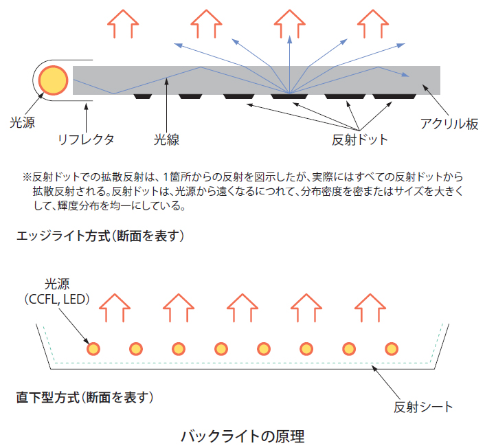 バックライトには、エッジライト方式(サイドライト方式、導光板方式とも言う)と直下型方式がある。エッジライト方式は、アクリル製の導光板の側面に冷陰極蛍光ランプ(CCFL)やLEDなどの光源を配置し、側面から入射した光は導光板の表裏でアクリルと空気との界面の臨界角 2)を利用し、全反射を繰り返し導光板の広い面積に広がり、裏面に設けられた反射ドットで拡散反射して、導光板の広い面積から光を均一に放射する。直下型方式では、液晶の後方に多数のCCFLやLEDなどの光源を配置して光を均一に放射する。