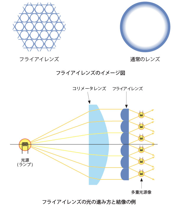 フライアイレンズ fly eye lens ふらいあいれんず 解説 フライアイレンズとは、レンズを複数枚使用し、蝿の目のように縦横マトリクス状に配列したレンズ体のこと。イングレータレンズともいう。 構成するレンズの数だけ多重像を生じ、光源が点光源として扱える程度に小さい場合には、多数の点光源が作られることから、照射面を均一な照度分布にする際に用いられる。 半導体やTABテープなどの露光装置に使用される。 関連用語 インテグレータレンズ (インテグレーターレンズ) 光源 TABテープ 露光装置 関連製品 関連URL 付属資料 用語50音一覧 あ行 か行 さ行 た行 な行 は行 ま行 や行 ら行 わ行