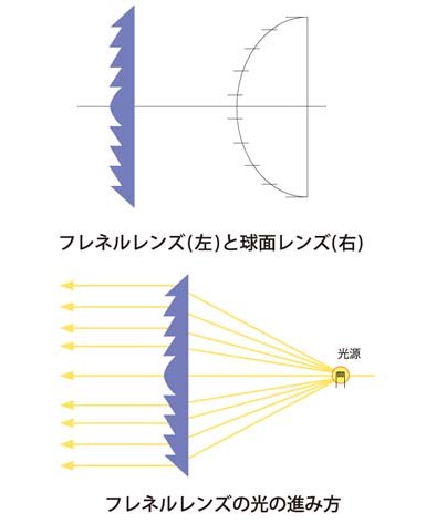 光を絞って遠くに送るには、明るい光源と大きなレンズ系が必要となる。それを避けるために、球面レンズの表面部分を細かく分解し、ぎざぎざの段差をつけ、プリズムを並べたように配置することで、レンズの大きさや厚みを抑えることができる。