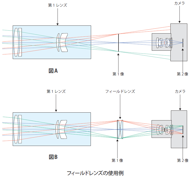 第1レンズで第1像を作成し、これをカメラで撮る場合、第1像の中央の光はカメラに入っているが、像周辺の光はカメラに入っていない。このため、カメラで撮った第2像は周辺が暗くなってしまう(図A)。この問題を解決するのがフィールドレンズである。フィールドレンズは結像にはほとんど寄与しないが、光の進行方向を変えるはたらきをする(図B)。
